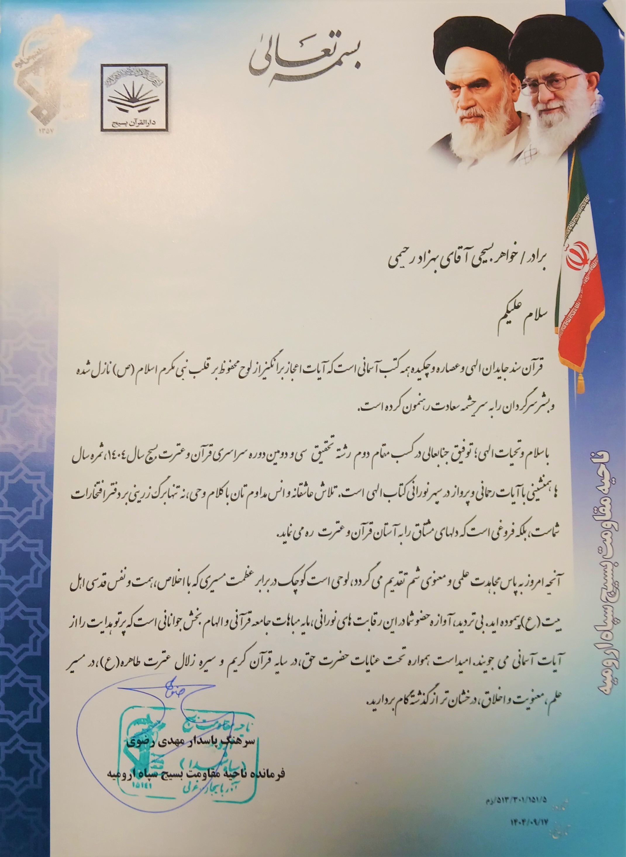 کسب مقام اول رشته تحقیق توسط آقای بهزاد رحیمی در سی و دومین دوره سراسری قرآن و عترت بسیج